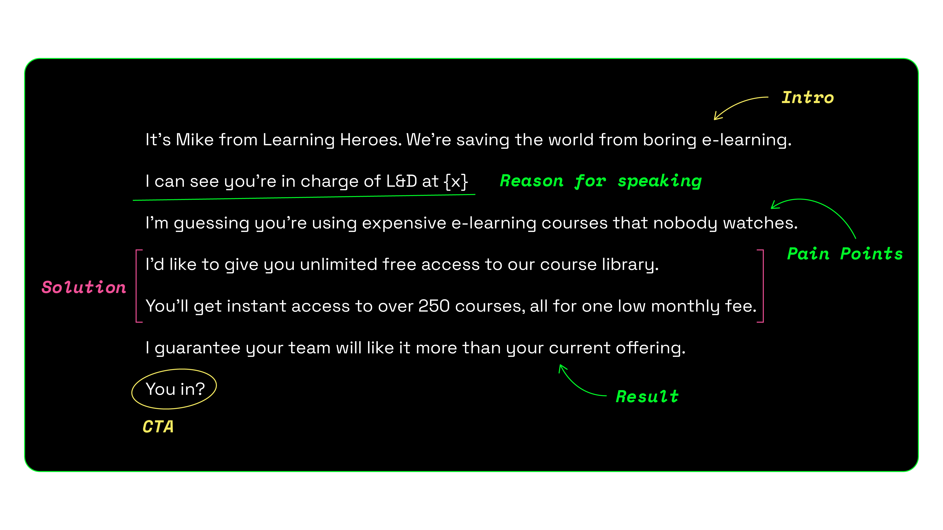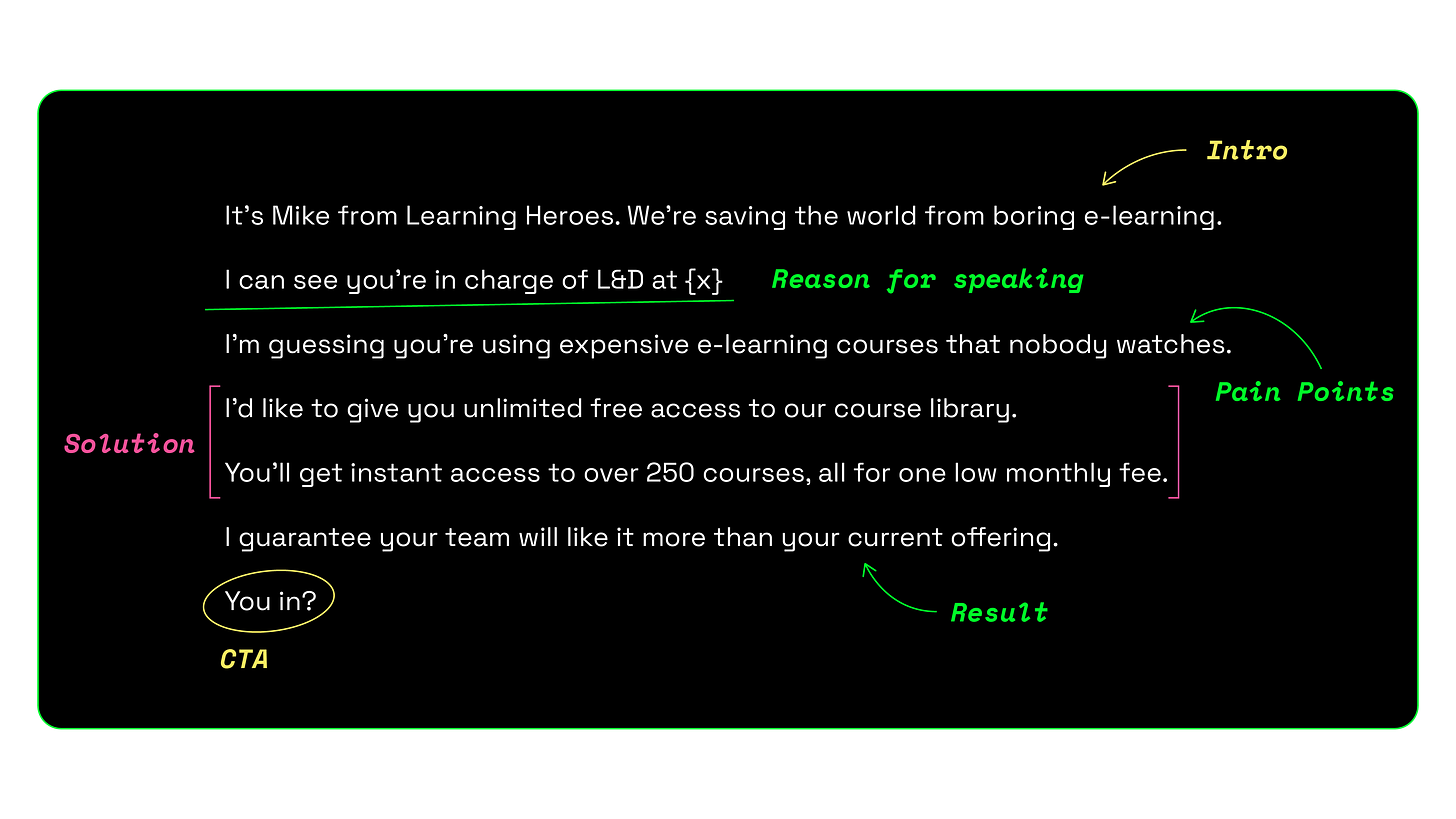 During cold calls, Iâd say âtell them itâs the saving the world from boring e-learning guysâ and it was a great conversation starter, giving me a chance to close.Â